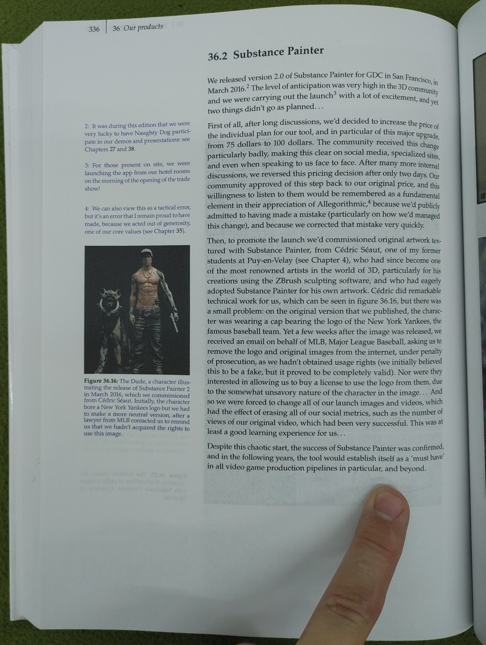 36.2 Substance Painter We released version 2.0 of Substance Painter for GDC in San Francisco, in March 2016.² The level of anticipation was very high in the 3D community and we were carrying out the launch³ with a lot of excitement, and yet two things didn't go as planned [...] Despite this chaotic start, the success of Substance Painter was confirmed, and in the following years, the tool would establish itself as a "must have" in all video game production pipelines in particular, and beyond.Book cover: